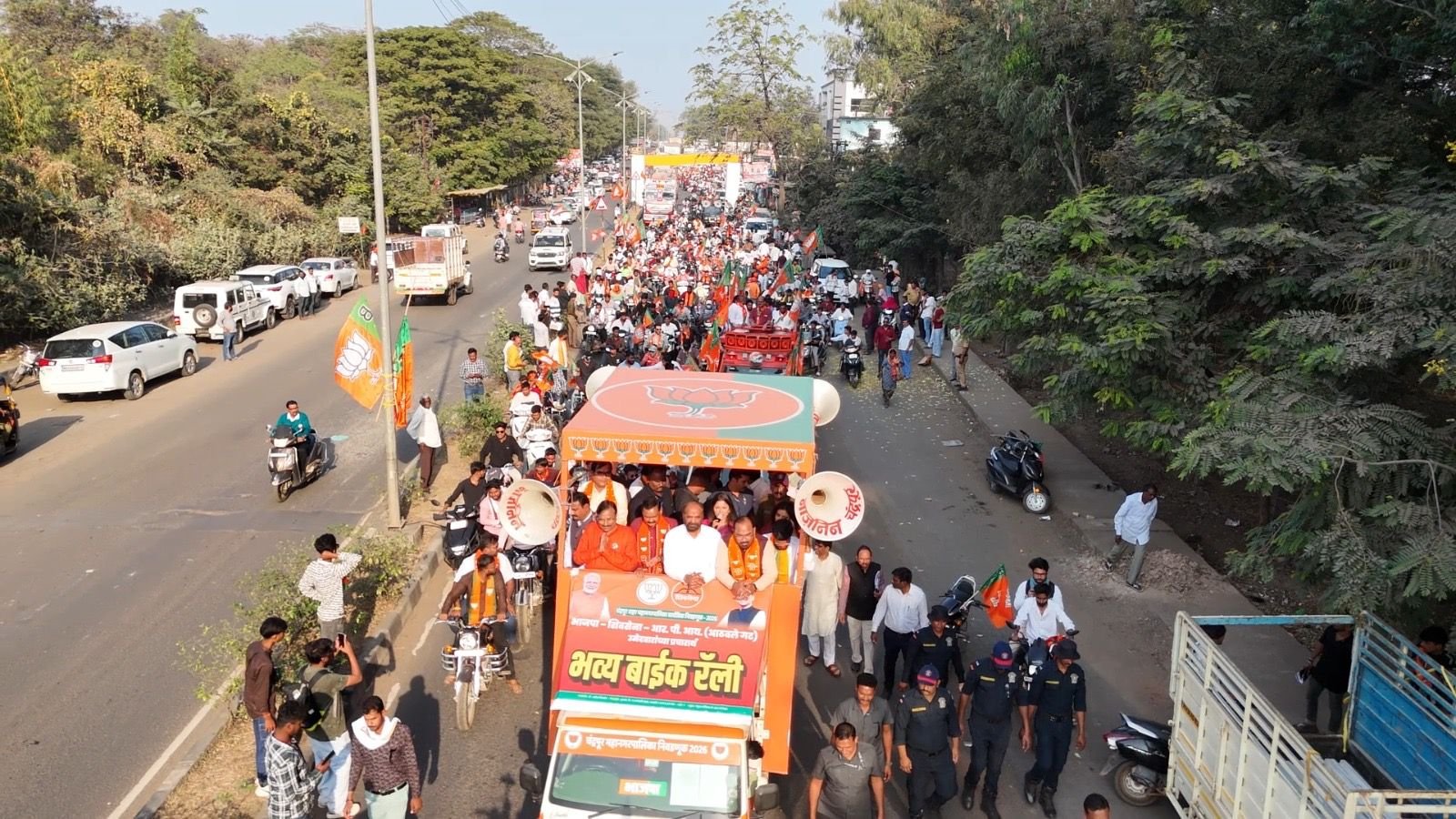 ५ हजारांहून अधिक दुचाकींच्या सहभागाने चंद्रपूरात शक्तिप्रदर्शन. चंद्रपूर महानगरपालिका निवडणूक २०२६ च्या पार्श्वभूमीवर भारतीय जनता पार्टी, शिवसेना व आरपीआय (आठवले…
