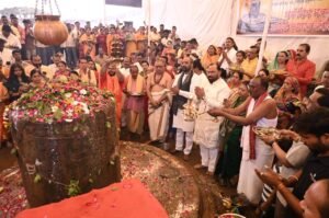 चंद्रपूर : महाशिवरात्री महोत्सवानिमित्त लालपेठ, भिवापूर वार्ड, येथील सुमारे ३०० वर्षे पुरातन व महाराष्ट्रातील सर्वात विशाल महाशिवलिंग स्थळी आज सकाळी १०८ दांपत्यांच्या हस्ते महाआरती करण्यात आली. यावेळी आमदार किशोरभाऊ जोरगेवार सहपत्नीक उपस्थित होते. वेदमंत्रांच्या गजरात आणि ‘हर हर महादेव’च्या घोषणांनी परिसर दुमदुमून गेला होता.